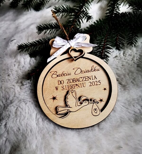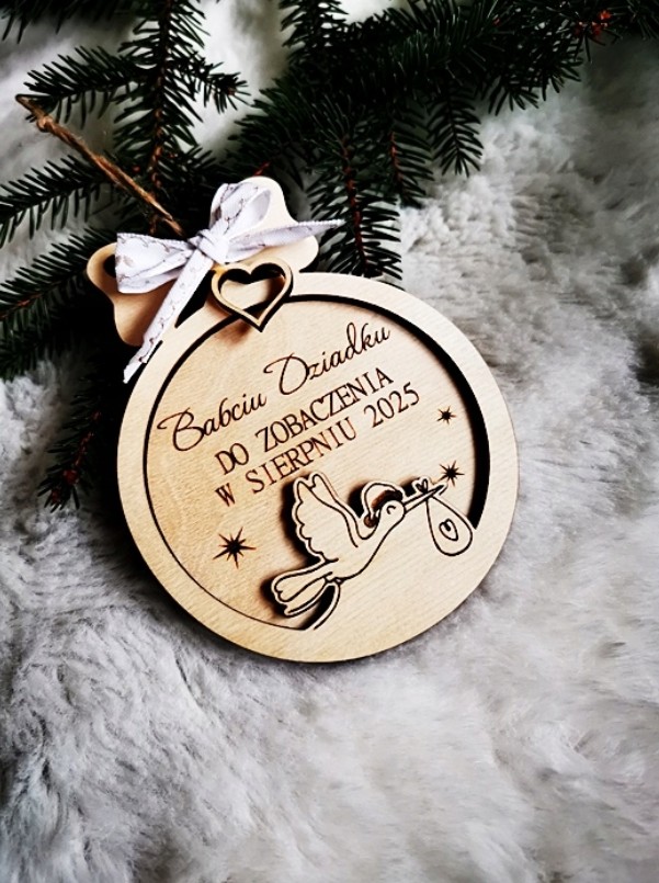 Ta wyjątkowa drewniana bombka to idealny wybór na prezent z okazji  Świąt Bożego Narodzenia. Wykonana z naturalnego drewna (sklejka). Grawerowany tekst na bombce sprawi, że stanie się ona wyjątkową pamiątką na lata i doskonałym wspomnieniem tego pięknego wydarzenia. Idealna forma przekazania informacji o nadchodzącym wydarzeniu, niezwykle wzruszający prezent.