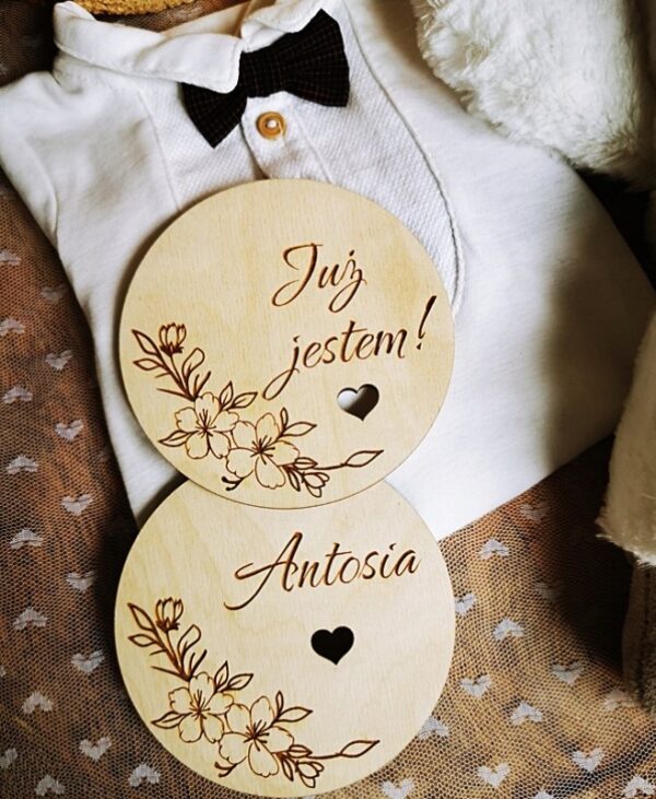 Plakietki to uroczy sposób na dokumentowanie ważnych chwil w życiu malucha. Zestaw  zawiera 2 plakietki z napisem „już jestem” oraz imieniem dziecka.