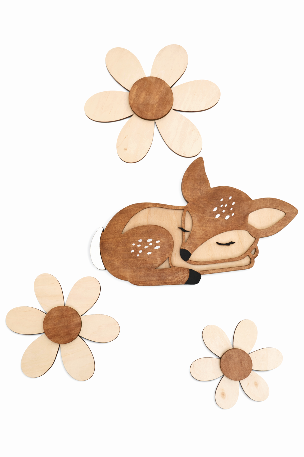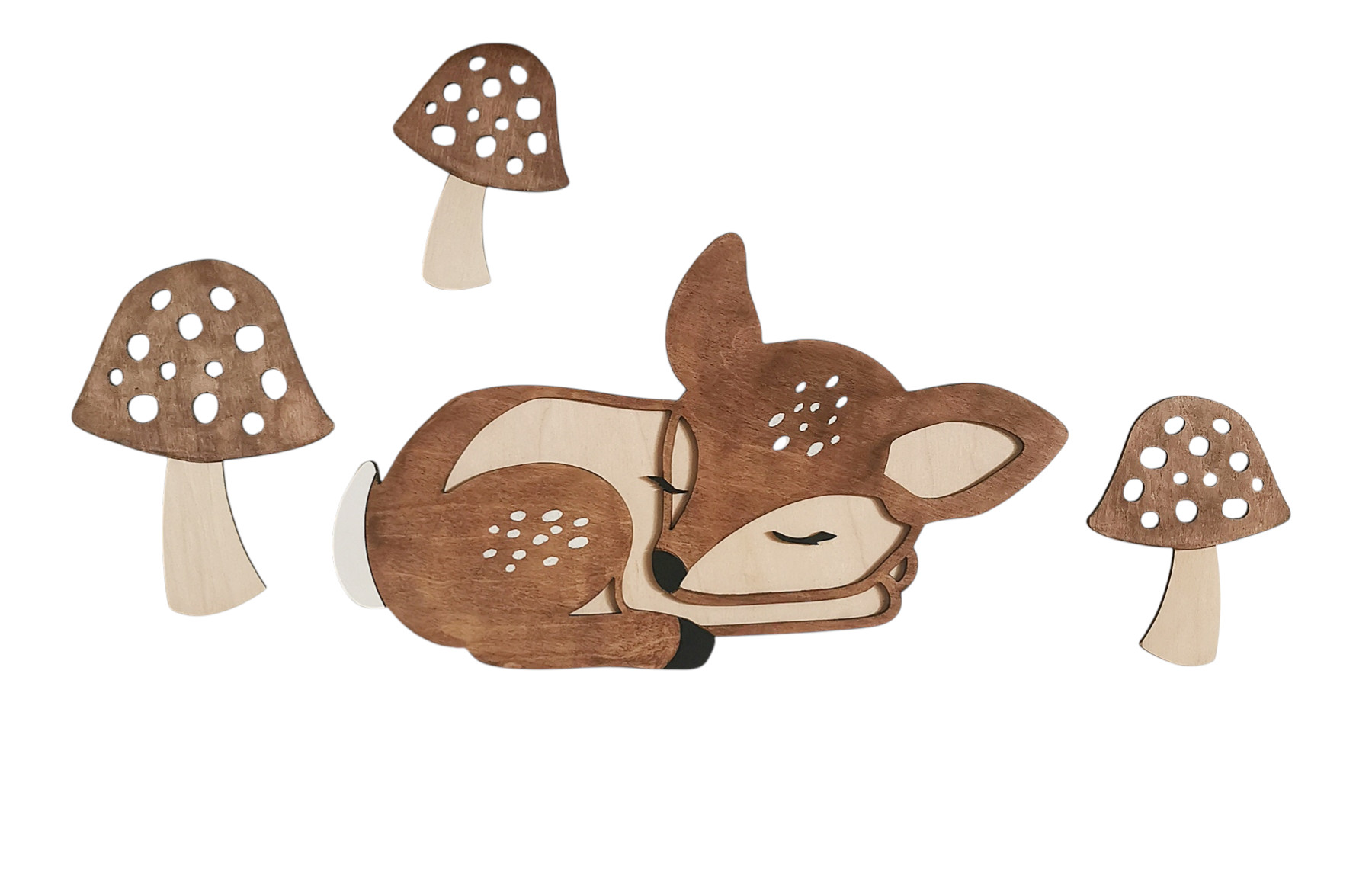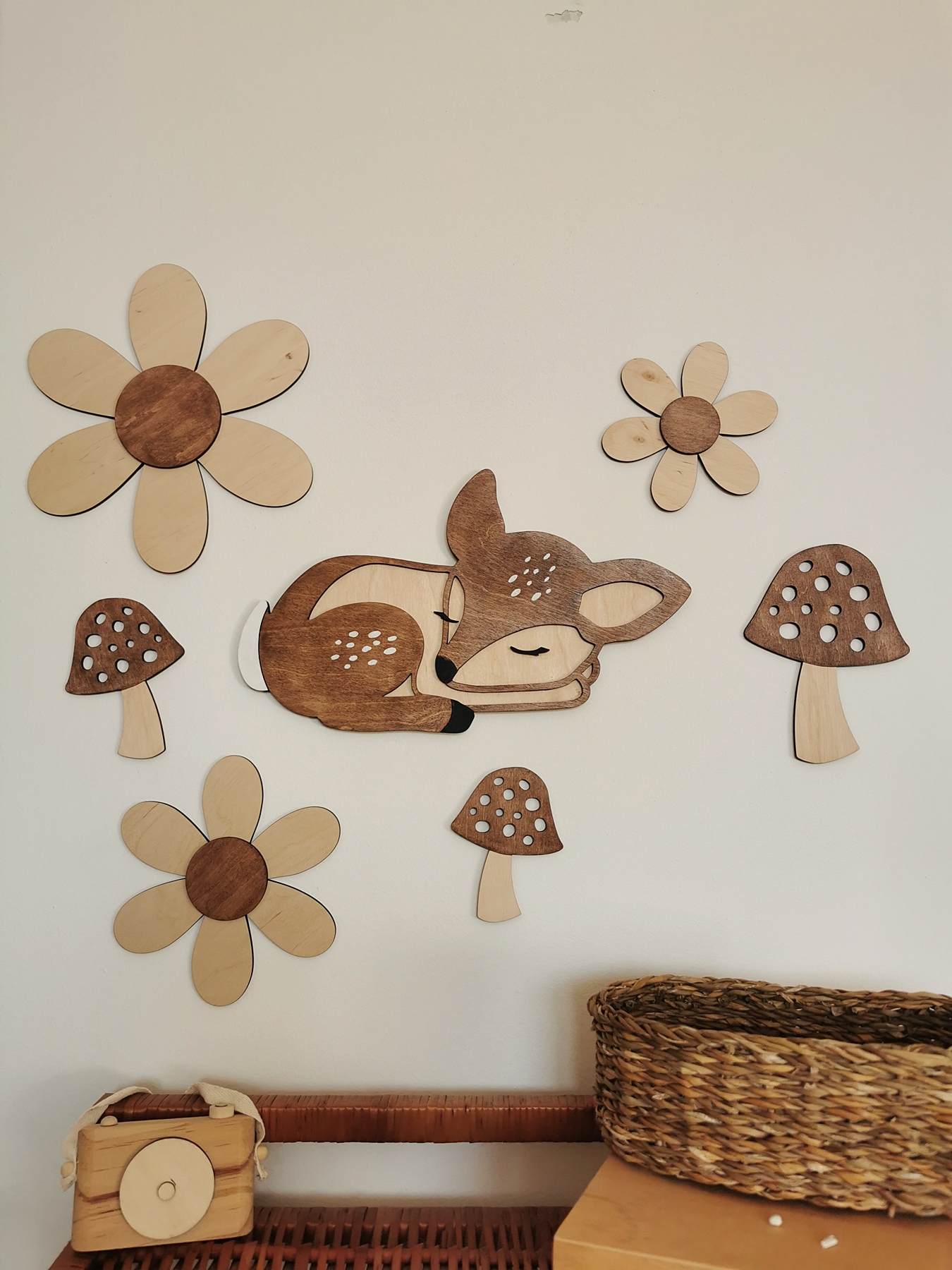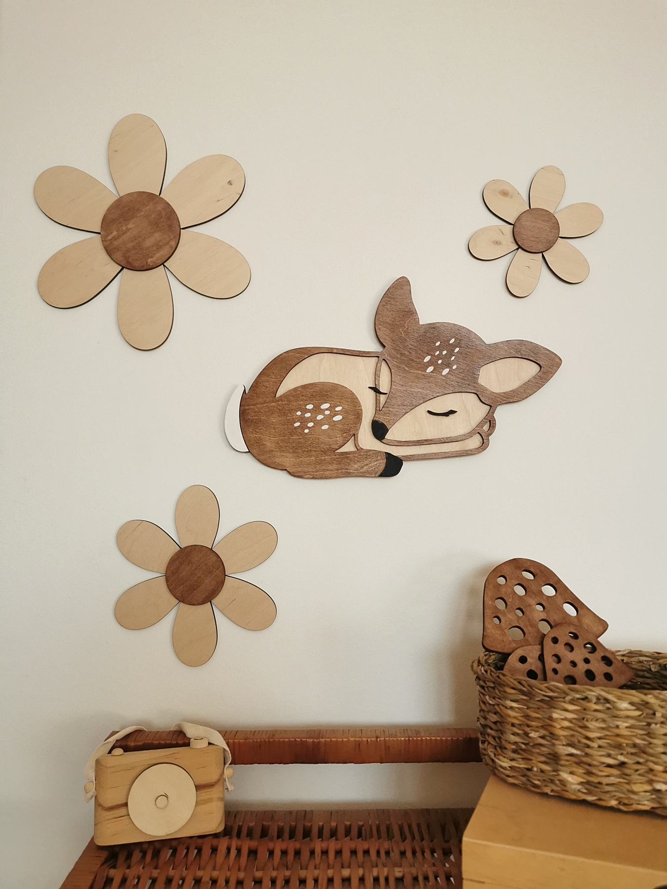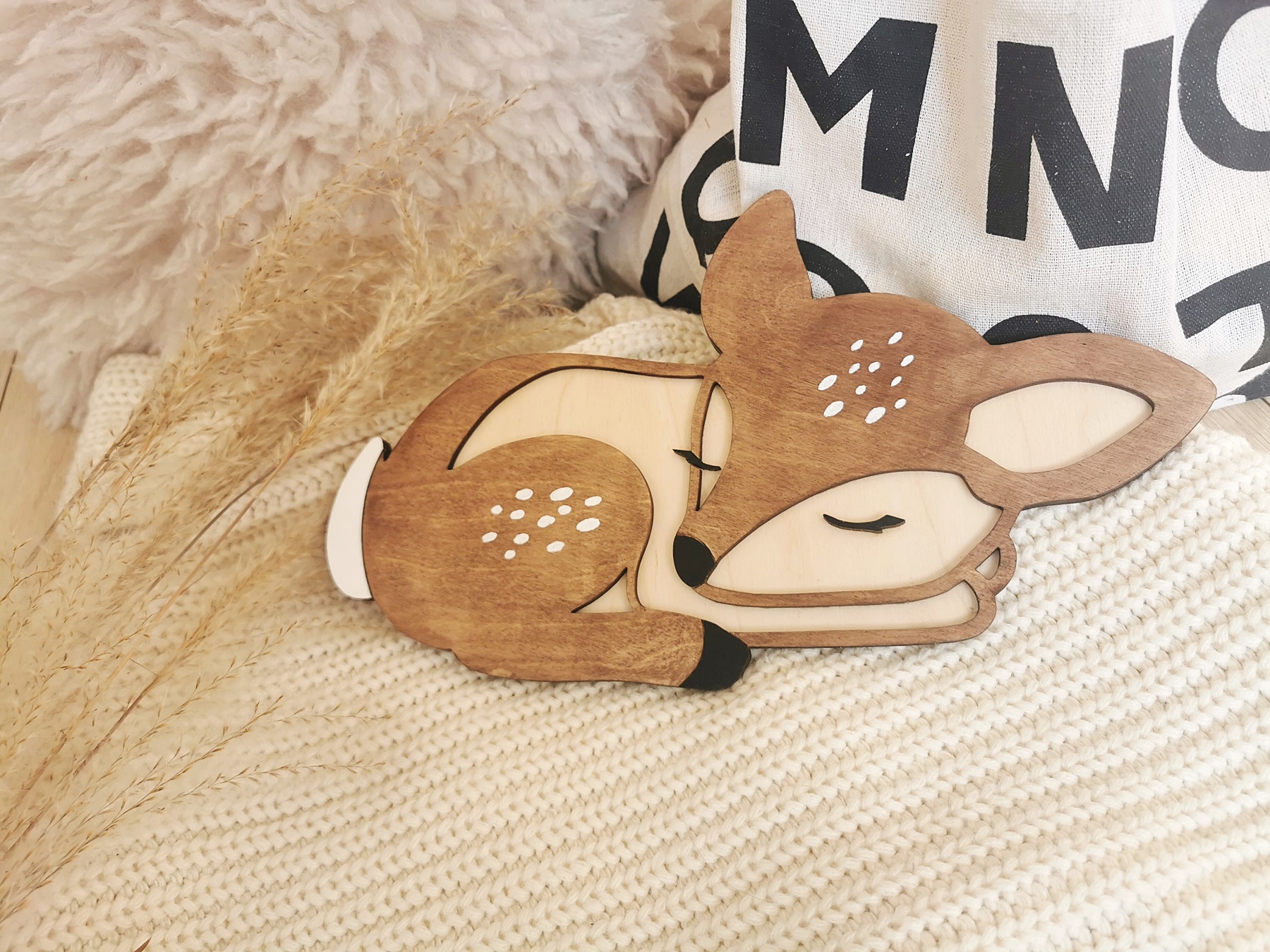 Urocza, śpiąca sarenka wykonana ze sklejki drewnianej to wyjątkowa dekoracja, która wprowadzi do wnętrza ciepło, naturalność i bajkowy klimat. Sarenka pomalowana jest w naturalnym odcieniu drewna, co podkreśla jej delikatny, leśny charakter i sprawia, że pięknie komponuje się z jasnymi, przytulnymi aranżacjami w stylu boho, skandynawskim czy woodland.